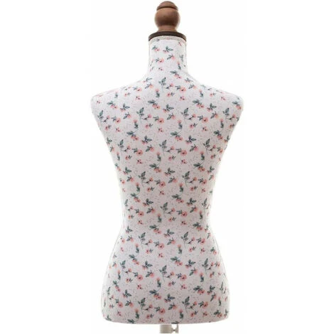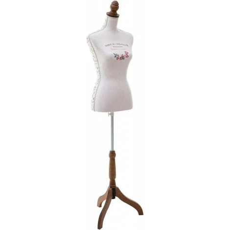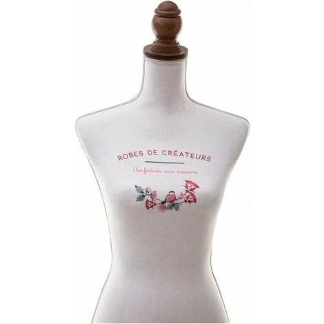 Mannequin décoratif avec inscription sur le devant et motifs de fleurs et d’oiseau.