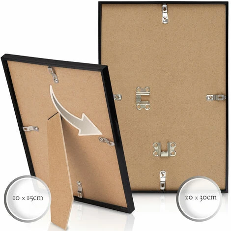 Ces cadres peuvent être utilisés dans une seule pièce où être placés sur un seul mur afin de créer un effet déco que ce soit en position paysage ou portrait . De plus, les cadres sont équipés d’attaches en métal qui leur permettent d’être accrochés aux murs. En plus, les cadres avec les dimensions de 10,5×15, de 13x18cm et de 15x20cm sont équipés de pieds qui leur permettent d’être posés sans problème sur vos tables ou meubles. Les cadres de la taille 20x30cm n’ont pas de pied.