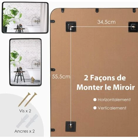 - Il y a 2 façons de monterun miroir – vertical ou horizontal à travers 3 supports arrière. De plus, 2jeux de vis d’expansion sont inclus dans la livraison et veuillez mesurer ladistance avant le montage. Contrairement au verre ordinaire qui se brise etémet des projections, notre miroir mural est un choix beaucoup plus sûr avecune couche anti-éclats et anti-buste. Il garantit également un reflet clairpour le rasage et le maquillage quotidiens. Le contour en métal mat encadre lemiroir de manière stable et ajoute un style classique à votre salle de bain,couloir, salon et plus encore. Dimensions 91 x 61,5 cm/76,5 x 56,5 cm/62 x 41,5cm (L x l), choisissez parmi l’un de nos magnifiques miroirs de salle de bainrectangulaires pour compléter votre maison nouvellement construite ou rénovée.