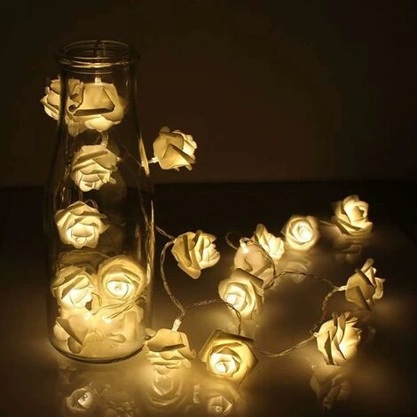 Vous recevrez une guirlande lumineuse LED avec 20 LED blanc chaud sur un câble transparent, avec une rose sur chaque LED.
