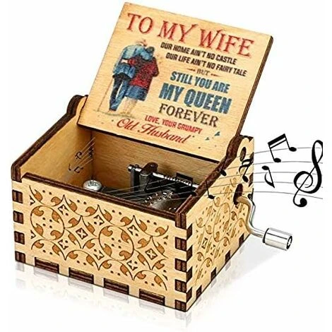 Boîte à musique avec citations : « To my wife, our home n’est pas un château, our life ain’t no fairy tale, but still you are my queen forever. Amour, votre vieux mari grincheux ; qui a connu l’amour le plus profond d’un vieux couple. Le thème de la boîte à musique est « U are my sunshine ».