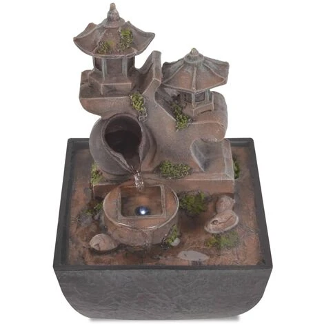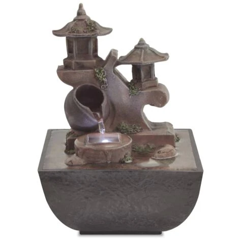 La fontaine est faite de polyrésine. L’écoulement de l’eau en cascade est éclairé par des LED, ce qui crée un effet visuel saisissant, surtout la nuit. Les multiples courants d’eau et le son apaisant de l’eau qui coule créent une atmosphère relaxante et méditative. La pompe de haute qualité incluse assure un fonctionnement sûr et fiable.