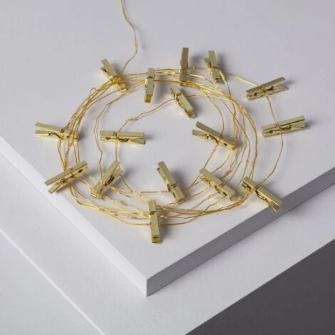 La Guirlande LED Fil de Fer avec Pince à Linge Dorée, vous permet de décorer n’importe quel espace ou événement, même si vous ne disposez pas de prise de courant. Elle incorpore 16 pinces à linge avec deux LED chacune avec lesquelles vous pouvez accrocher des photos ou des cartes.