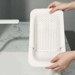 - ?Design pratique? Grâce à la passoire au-dessus de l’évier pour vider les pâtes, les fruits et les légumes facilement. La passoire peut être poussée et étendu de 14,5 à 19,5 pouces pour contenir plus de nourriture et de vaisselle ainsi que des éviers de différentes tailles, tandis que les deux poignées peuvent être placées sur le bord de l’évier pour que vous puissiez facilement serrer les aliments.