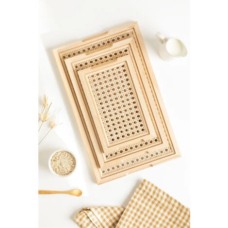 Suivant les dernières tendances en matière de décoration et misant sur un style naturel, le lot de 3 plateaux Arxie deviendra l’élément de décoration indispensable pour votre salon, entrée, coiffeuse ou séjour. Réalisés en bois de pin et décorées en rotin selon la technique du cannage, ils apporteront une touche simple et sophistiquée à votre pièce. Les plateaux Arxie sont parfaits pour garder vos affaires du quotidien toujours à portée de main et à tout moment. Produit fabriqué avec du bois naturel, pariant sur un style de mobilier durable et sans application de traitements chimiques ou de vernis. Pour le nettoyage, utilisez un chiffon humide et évitez l’utilisation de produits chimiques. Dimensions (Hauteur x Largeur x Profondeur): 2 – 8,5 cm x 24,2 – 38,2 cm x 15,2 – 25,1 cm IMPORTANT : Le service standard porte-à-porte ne comprend pas la livraison et la collecte des marchandises au domicile du client, qui sont à la charge de ce dernier. Il est possible que le livreur aide volontairement à la livraison de la marchandise (ceci est totalement volontaire pour le livreur et la société de transport et ne relève pas de la responsabilité de Sklum).L’assemblage n’est pas non plus inclus.