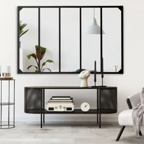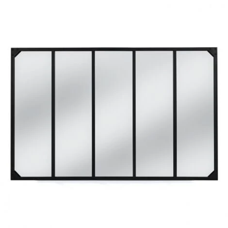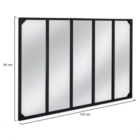 Profitez de ce joli et grand miroir 5 bandes pour donner une touche industrielle et tendance à votre intérieur.Parfait pour décorer toutes les pièces de votre maison, ce miroir au style contemporain apportera de la luminosité et agrandira votre salon, entrée, chambre ou encore votre salle à manger !Son côté verrière très élégant donnera du cachet à votre pièce, que vous souhaitiez le placer horizontalement ou verticalement.Sa structure en métal conférera solidité et robustesse au miroir. De plus, il dispose d’une fixation à l’arrière pour une pose murale horizontale.Ce large miroir peut aussi se poser sur le sol pour un effet loft new-yorkais avec son style factory qui se mélangera facilement à une décoration classique ou plus moderne.Laissez-vous séduire par ce superbe miroir 5 bandes en métal qui agrandira la pièce avec élégance !N’hésitez pas à compléter votre décoration avec notre collection métal et notre collection industrielle pour accentuer ce style indus très en vogue.Dimensions du miroir 5 bandes industrielDimensions globales : Longueur 140 cm x largeur 2,5 cm x Hauteur 90 cmColoris : noir Matériaux : verre et métalAccroches incluses pour une fixation muraleÀ monter soi-mêmeCe miroir est également disponible en version 4 bandes.Retrouvez également d’autres modèles de miroirs sur notre boutique en ligne !