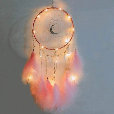 Nice Dream Petit Attrapeur De Rêves Avec Lumière LED, Capteur De Rêves Avec Plumes Fait Main, Décoration Murale Ornement Maison – 15 Cm De Diamètre, 48 Cm De Longueur (Rose)