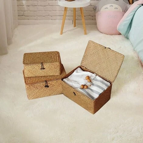 Panier De Rangement En Rotin Tressé Avec Couvercle Paniers à Linge En Jonc De Mer Organisateur De Maquillage Pour Salle De Bain, Salon, Cuisine – Disponible En 3 Modèles (S, M, L)