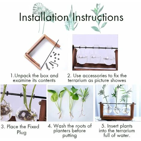 Joli accessoire photo – Convient au style Cool et Vintage Ins. Ce sera plus beau et accrocheur si vous remplissez la bouteille d’eau colorée ou si vous y mettez des galets, des fleurs ou un petit poisson. Vous pouvez même l’utiliser comme récipient pour les boissons.^ Matériaux – Le cadre est en bois naturel, surface marbrée; Trois terrariums à bulbes sont fabriqués en verre résistant à la chaleur en silicium à haute teneur en bore. (Pas facile à casser). Idéal pour les arrangements floraux, la décoration de la maison ainsi que diverses idées cadeaux. x 4″ D ; Chaque vase : 3,74 H x 2,75 W ; Ouverture – 1 pouce de diamètre. Taille appropriée parfaite pour le bureau au bureau ou à la maison. ^ Cadeau créatif à des amis – Idéal pour l’arrangement floral, la décoration de la maison ainsi que diverses idées de cadeaux. Joli cadeau pour vos jardiniers amoureux de la nature.Cadeaux de décoration de fête de mariage doux.^ Accessoires complets – Facile à installer et à verser de l’eau comme le montre la photo 5^.