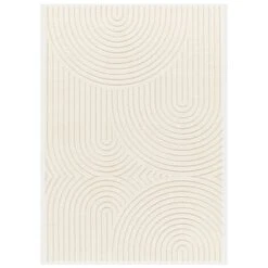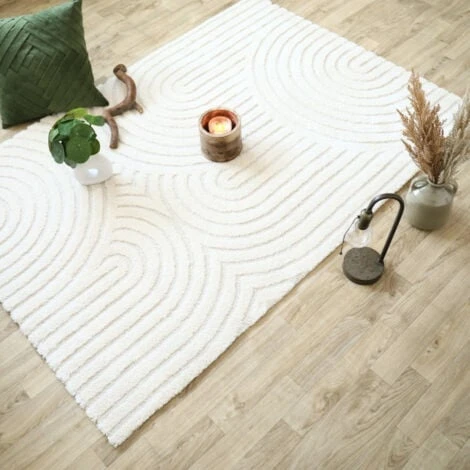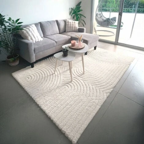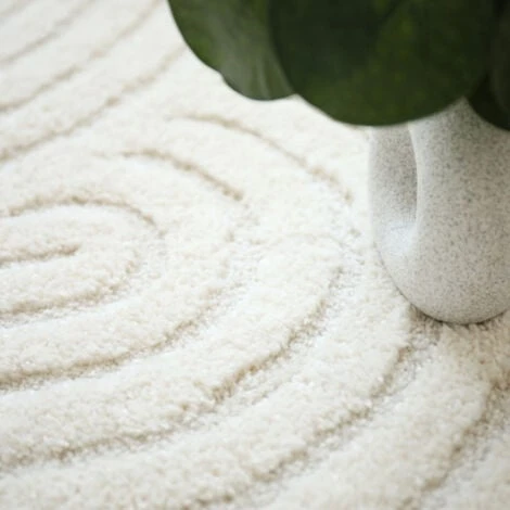 Tapis tendance cocoon très doux au design actuel, aux courbes naturelles en relief. Les lignes et les couleurs sont harmonisées avec des tons écrus et beige, pour ajouter chaleur et lumière à votre salon.